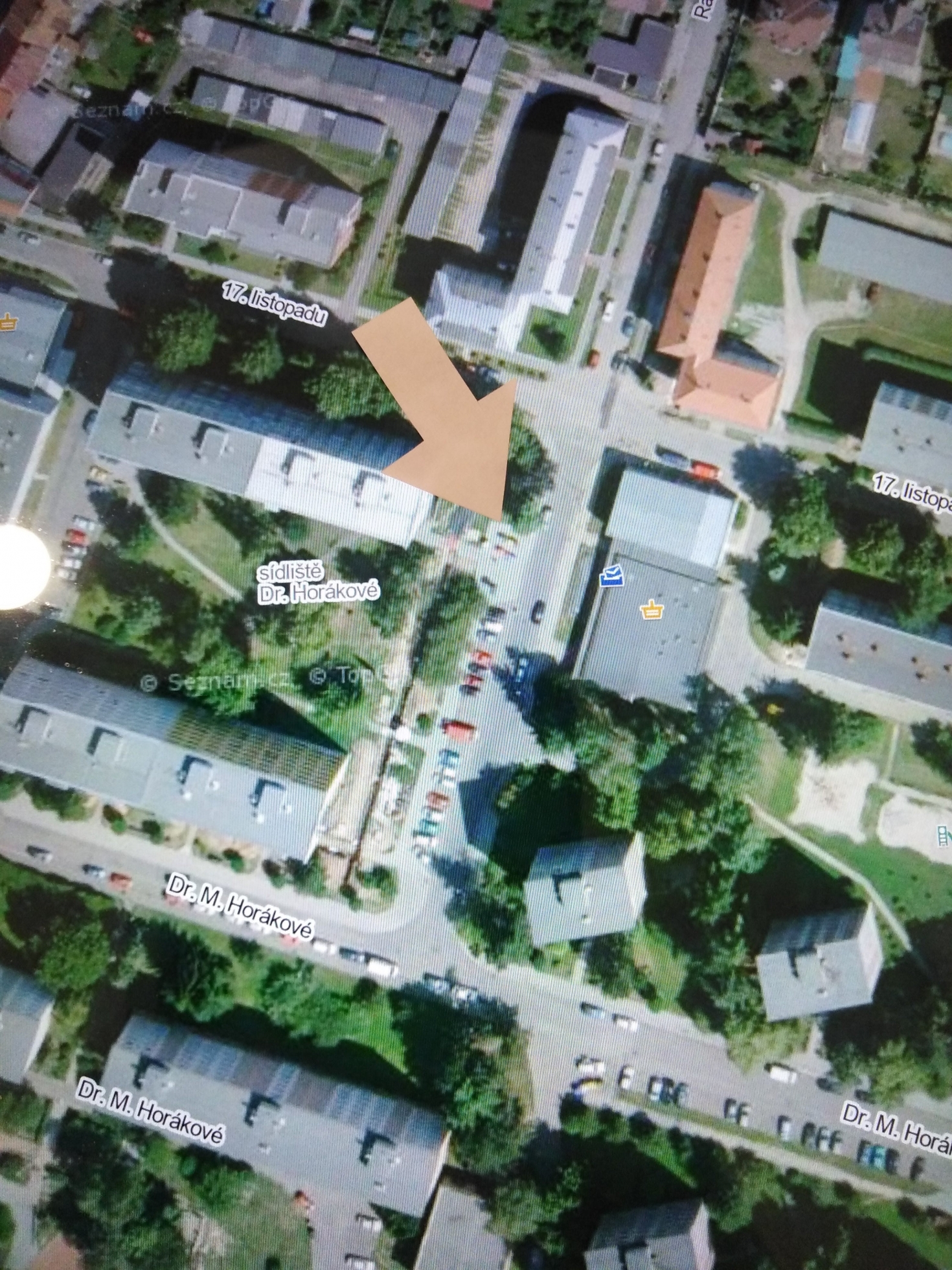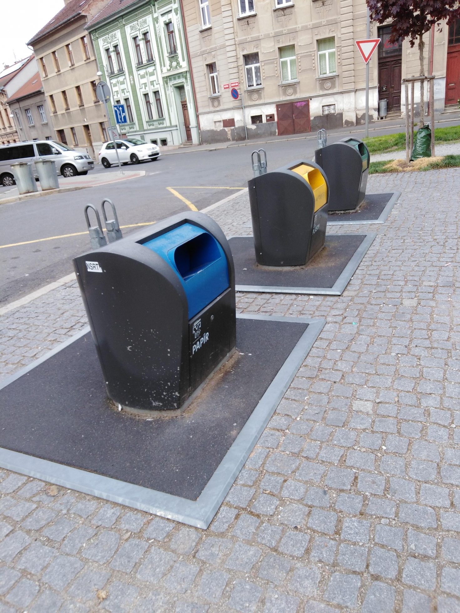 Mezi ulicemi Dr. M. Horákové x 17. listopadu se nachází stanoviště na tříděný odpad + kontejner na oděvy + kov.