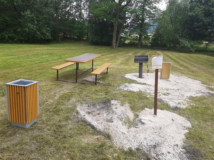 Vybavení: Místo by bylo opatřeno grilem, odkládacím stolkem, větším jídelním stolem, lavičkami, odpadkovým košem na směsný odpad a ideálně i košem na odpad tříděný. Dobré by bylo i umístění provozního řádu. Aby místo ještě více evokovalo rodinnou zahradní pohodu, navrhuji umístění rodinné houpačky.